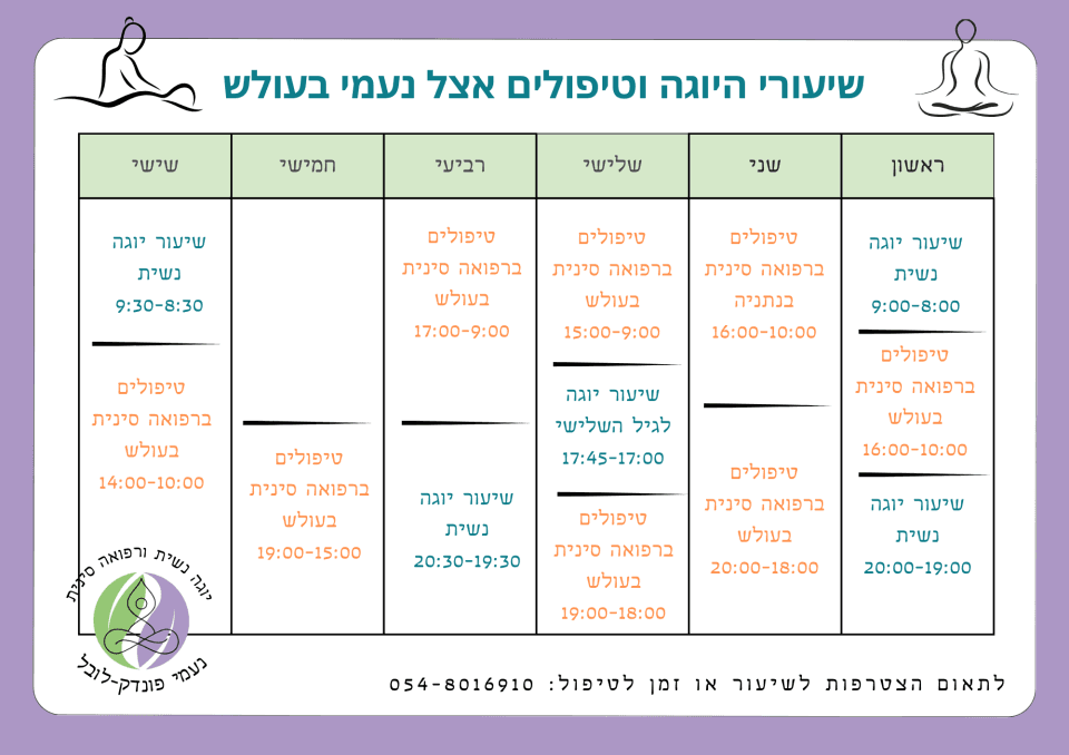 נעים להכיר,שמי נעמי פונדק לובל מאז שאני בת 14 עולמות היוגה והרפואה הסינית מלווים אותי ותומכים בבריאות שלי ואני ממשיכה לתרגל ולקבל טיפולים בעצמי. אני מאמינה שבריאות אמיתית היא לא רק העדר של מחלה, אלא מצב של חיוניות ושל זרימה ואיזון של הגוף והנפש. ואת הבריאות אפשר לטפח כל יום מחדש באמצעות תנועה, נשימה,תזונה טובה וטיפולים ברפואה משלימה. מזמינה אתכם להכיר אותי יותר דרך האתר הזה ולהעזר בי. |